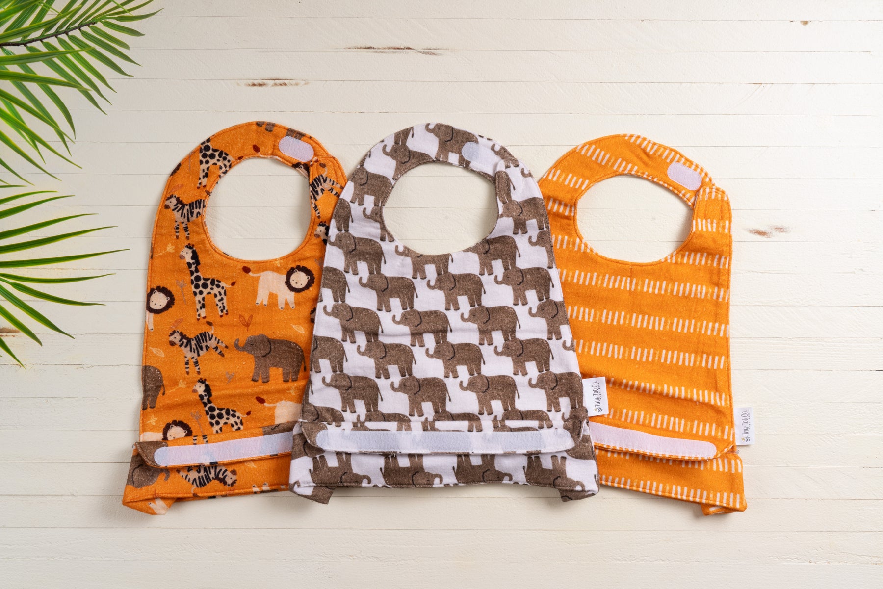 Our Animal Safari Set includes three bibs perfect for mealtime with your wild one. The cotton flannel material ensures easy cleaning, while the adorable animal prints and vibrant colors add a playful touch. The Animal Safari 3-pack features a playful animal combination print, a march of elephants and a dashed striped print. The coordinating patterns add joy to mealtime.