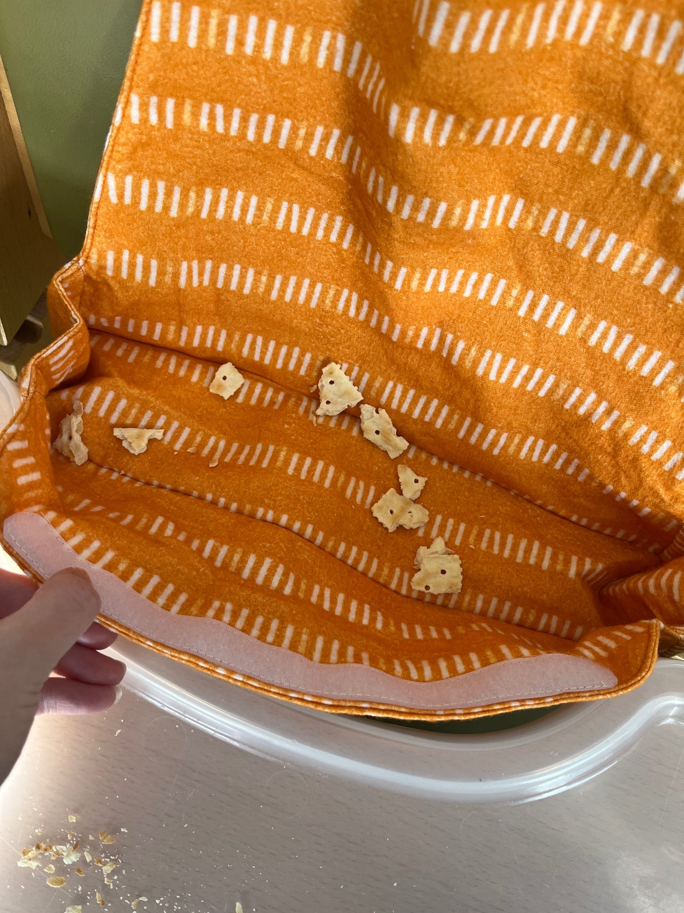 Unlike standard bibs, this bib attaches to the underside of a high chair tray to create a no-gap pocket that catches food before it falls.