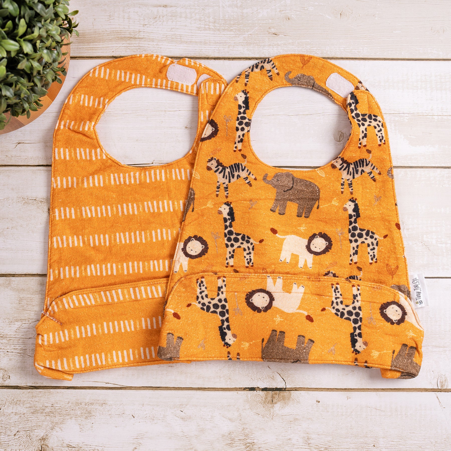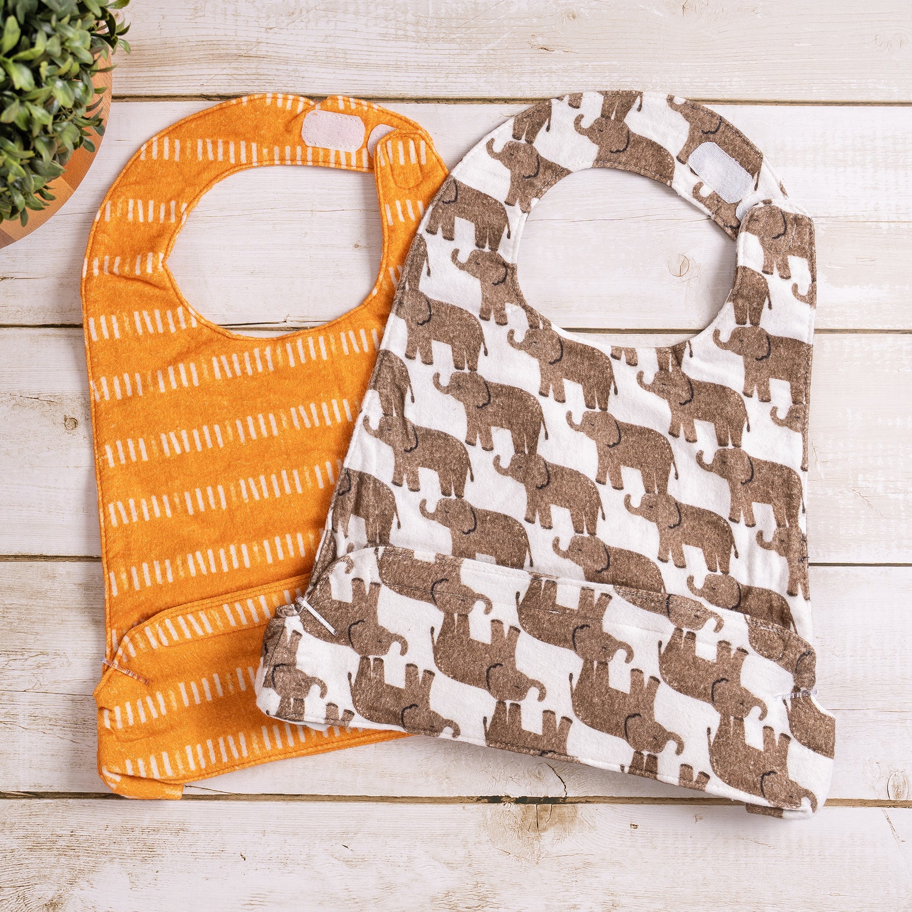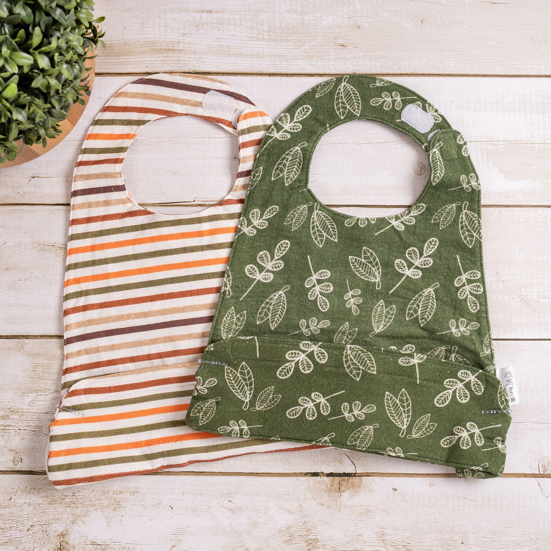 Our bibs are made of 100% cotton flannel. When you are ready to wash them, place them in the washing machine with cool water and tumble dry low. The first wash may cause some shrinking due to our bibs being made of only cotton. But do not worry, this will only happen once. As an added bonus, our bibs get softer with each wash.